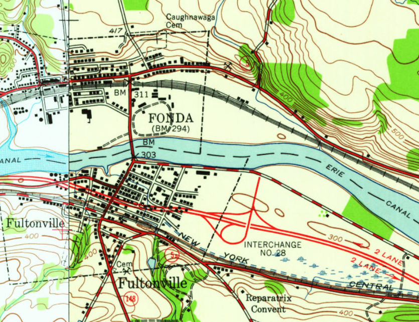 The current Erie Canal uses the river in this area. The dashed, double-blue line just north of the southern NYC route is labeled ABANDONED CANAL.
