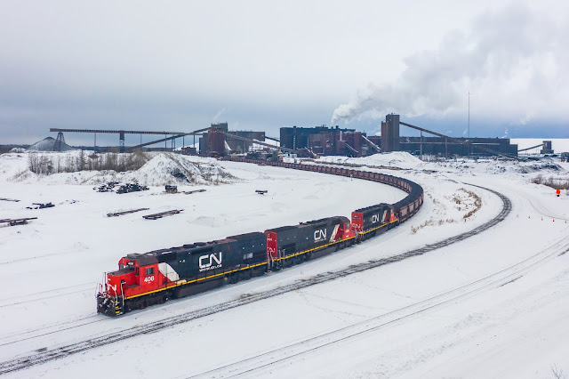 | Mtnclimberjoe Rail Photography posted A pair of DMIR Tunnel Motors and an IC SD40-3 slowly ease forward as they pull the last of their train of ore cars through the loader at the Fairlane Taconite Plant in Forbes, Minnesota. Once the loading is finished, the crew will depart southbound to take the loads down to Proctor. ====Info==== 1/16/2022 CN Missabe Subdivision Forbes, MN CN U71781-16 (Iron Ore Loads; Fairlane Taconite - Forbes, MN to Proctor, MN) DMIR 408 SD40T-3 Ex. SP 6776 SD45T-2R, SSW 9160 SD45T-2 Blt. 1972 DMIR 400 SD40T-3 Ex. SP 6770 SD45T-2R, SP 9196 SD45T-2 Blt. 1972 IC 6256 SD40-3 Ex. IC 6148 SD40-2, IC 6757, BN 6757 Blt. 1976 James Torgeson shared Looming in the background of this Canadian National pellet train is the Fairlane Pellet Plant. If that name sounds familiar, it's because this was once owned by the Ford Motor Company and was built to feed the blast furnaces of the Ford Steel Division at the Rouge. The nearby Thunderbird Mine has a similar name of Ford origin. This active facility is currently owned by Cleveland-Cliffs, as is the steel plant at the Rouge. John Sobaszko: Yet, The Cliffs Rouge Plant now gets all their ore from the Tilden Mine transshipped through Marquette. Interlake always seems to have 1-2 of their 4 smaller ships in turnaround service. [Cliff labels this plant as United Taconite.] Mtnclimberjoe Rail Photography shared |